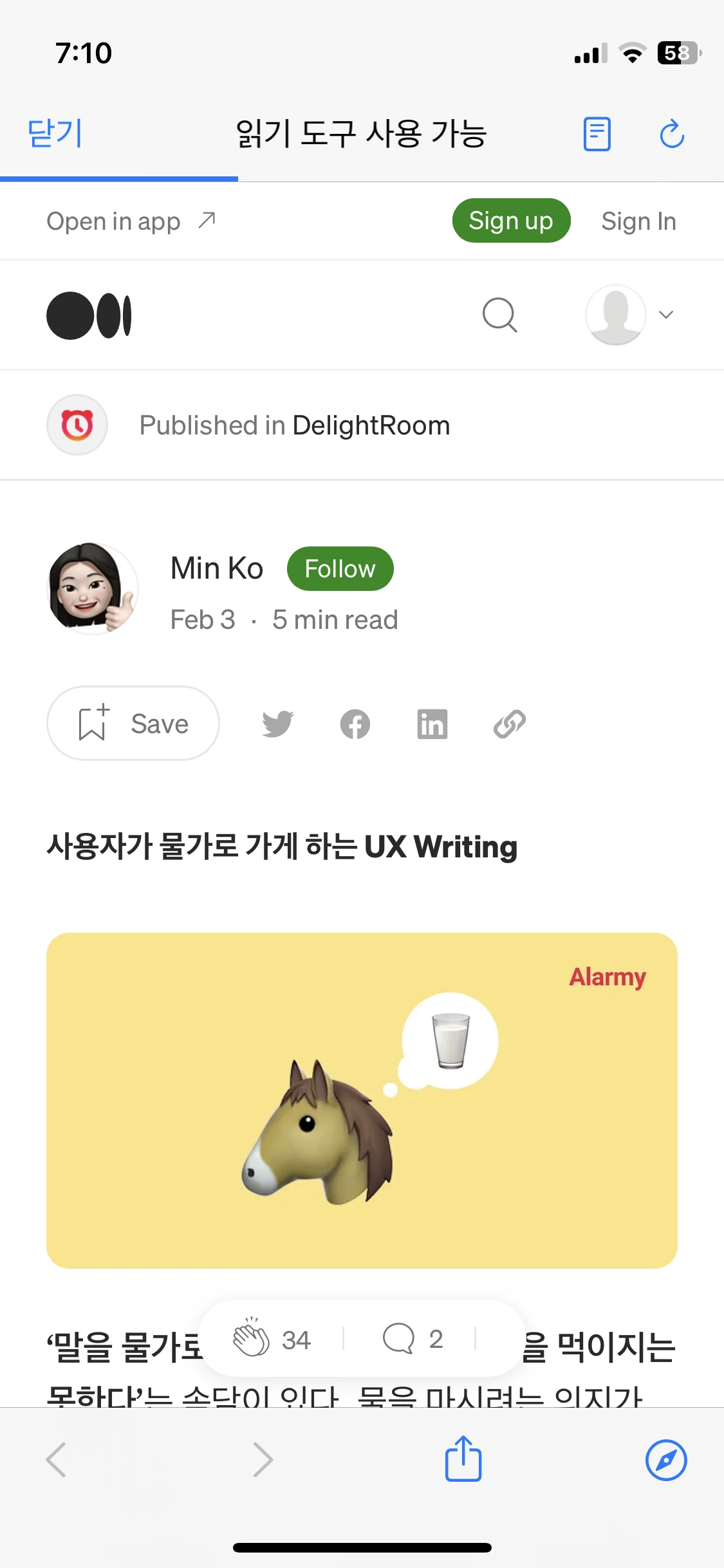 글을 읽다가 상단의 뒤로 가기 화살표를 누르면 다시 링크드인 피드로 돌아갈 수 있기 때문에 여전히 링크드인 앱 안에 있다고 생각하실 거예요.