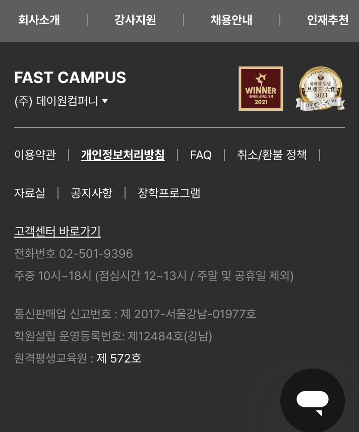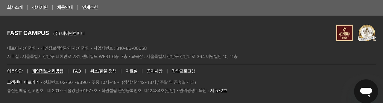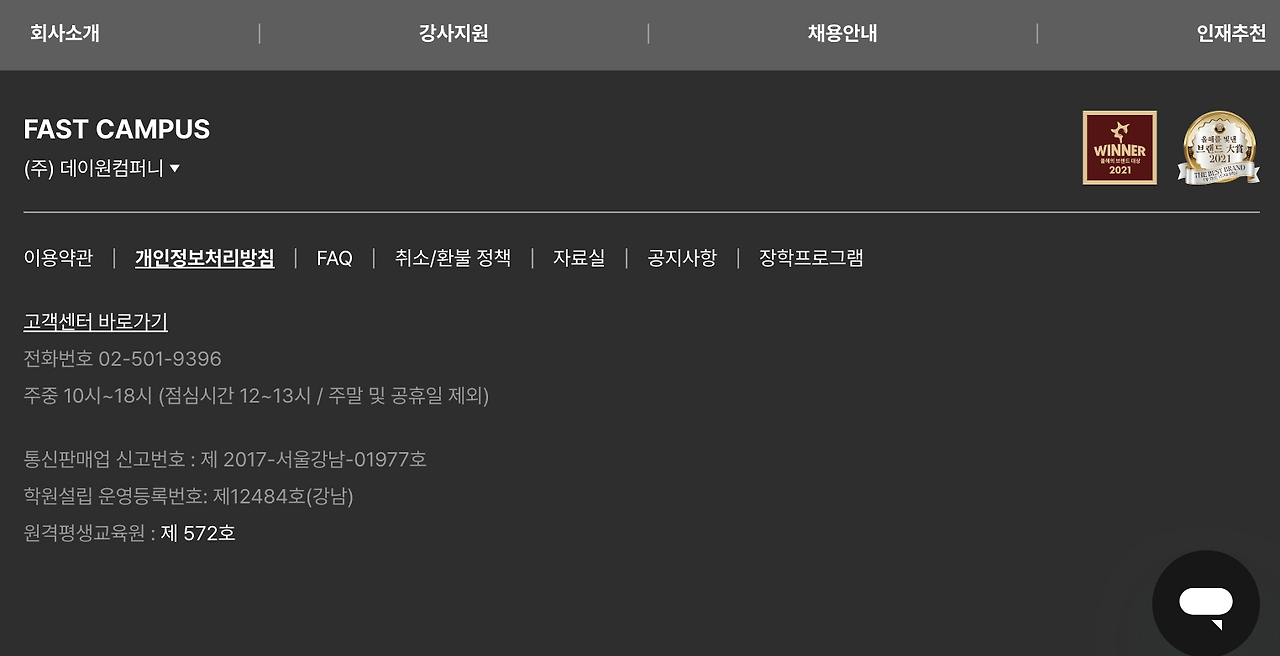 패스트캠퍼스의 푸터 디자인이 존경스러운 이유는 정말 모든 정보를 푸터에 다 넣었음에도 보기에 깔끔하단 점이에요.
