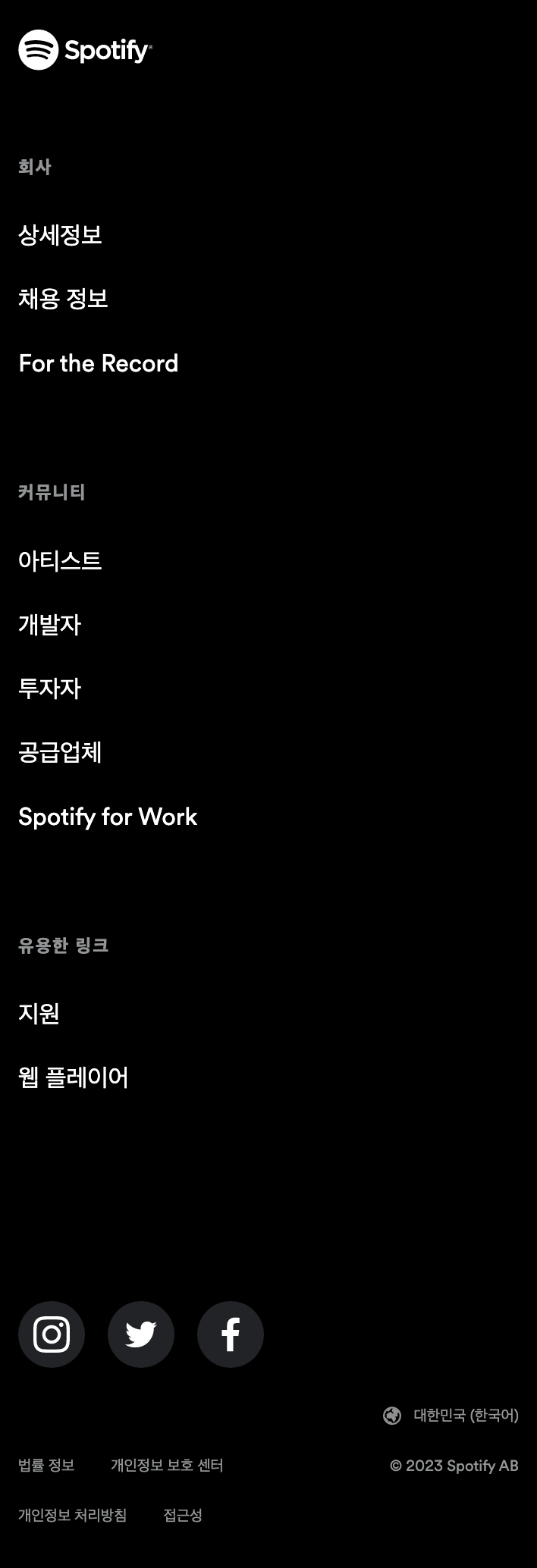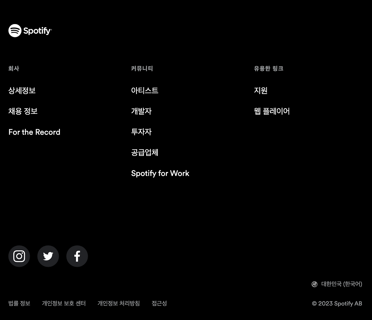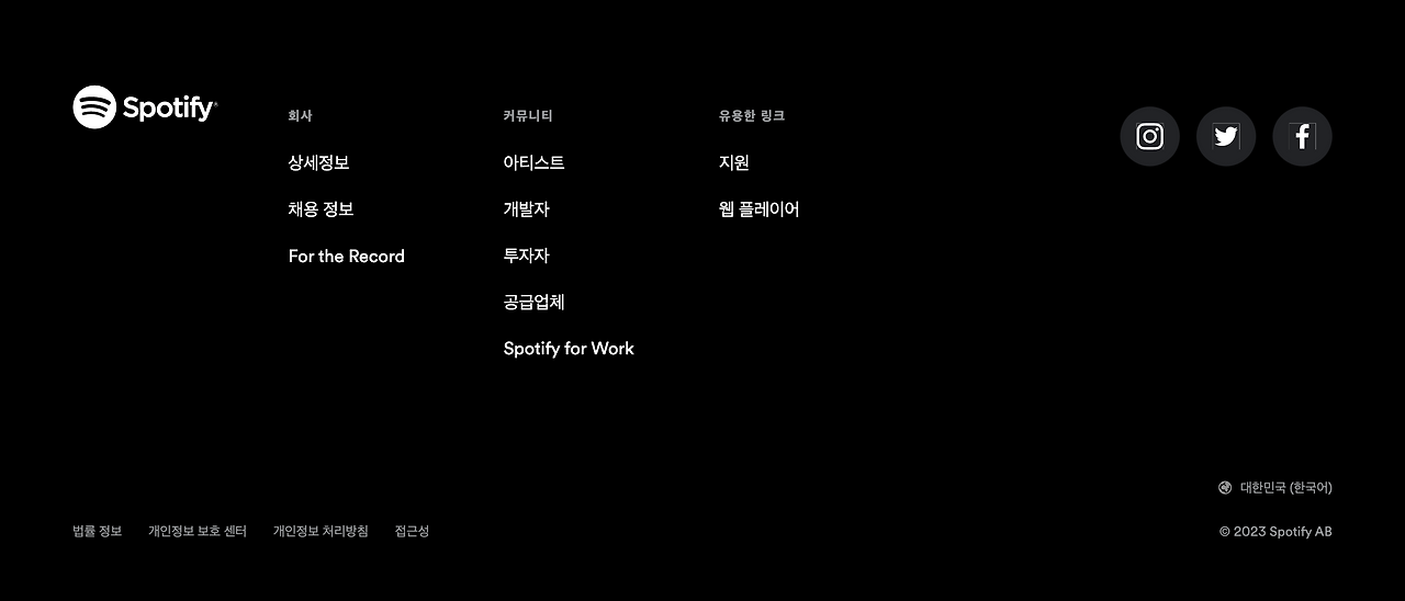 스포티파이 멤버십을 가입하려고 해당 페이지에 접근한 유저는 스포티파이의 푸터를 보고 이 서비스의 커뮤니티는 어떻게 형성되어 있는지, 역사는 어떻게 되는지에 대한 정보를 얻을 수 있어요.