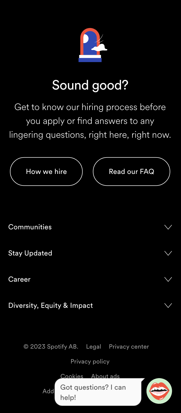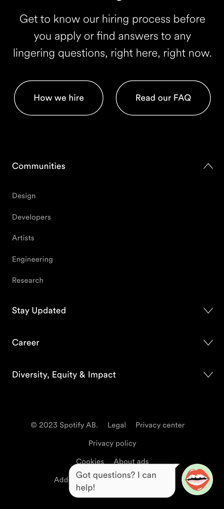 패스트캠퍼스 푸터가 회사 정보만큼은 모바일 화면에서 숨겨놓았다면, 모든 카테고리의 탭 버튼을 숨겨놓은 푸터 사례를 소개합니다. 바로 Spotify 채용사이트의 푸터예요. 푸터에는 정보를 최대한 숨기지 말아야 한다는 제 고정관념을 깨 주었습니다.