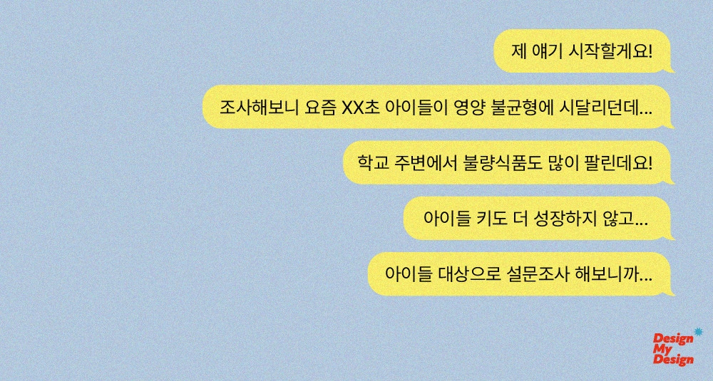 위와 같은 예시에서 문제 인식 파트를 작성해야 한다면 왜 영양 불균형에 시달리고 있는지, 왜 불량식품이 인기 있는지 등에 대한 '아이디어 제안자의 판단'이 포함되어야 한다.