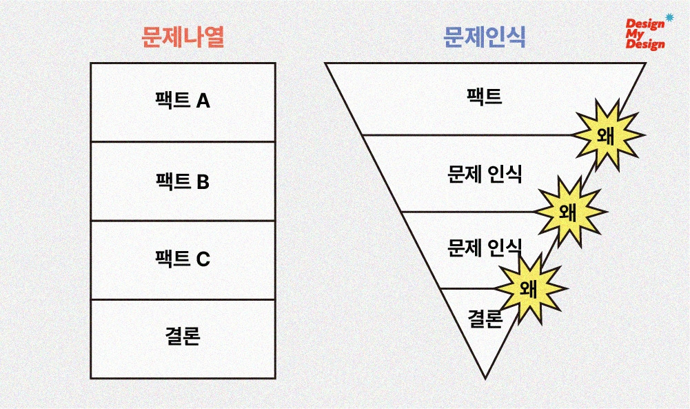 이 내용은 내 아이디어가 뭐냐에 따라서 달라질 수 있다. 꼭 영양 불균형이 식사 서비스 구독으로 이어지진 않을 것이다. (아마 내가 적은 것보다 훨씬 깔끔하게 문답을 이어갈 분들도 많을 것이다.) 내가 강조하고 싶은 부분은 이런 식으로 문제를 한 방향으로 몰아가는 것이 필요하다는 것이다. 내가 제안하고자 하는 아이디어에 근접할 때까지 왜?라고 물어야 한다.