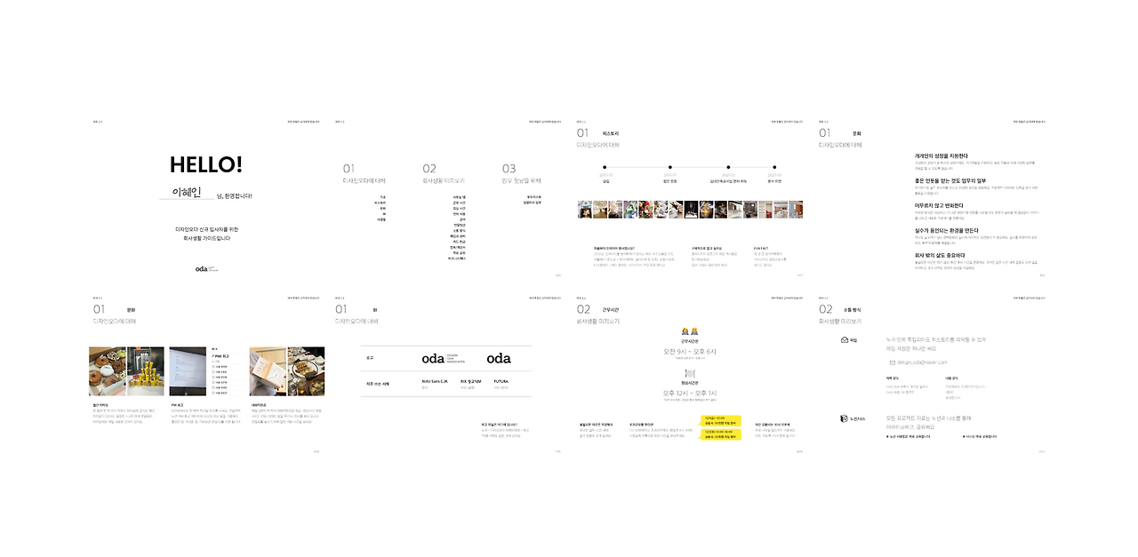 그래서 디자인오다는 '신규입사자 가이드'를 만들었습니다. 이 가이드를 토대로 회사에 대해 설명하는 OT 기간을 가졌죠. 맛보기로 잠시 보여드릴게요.