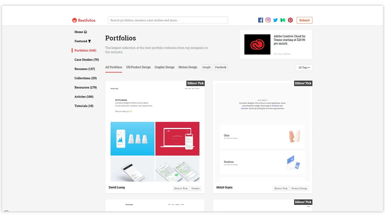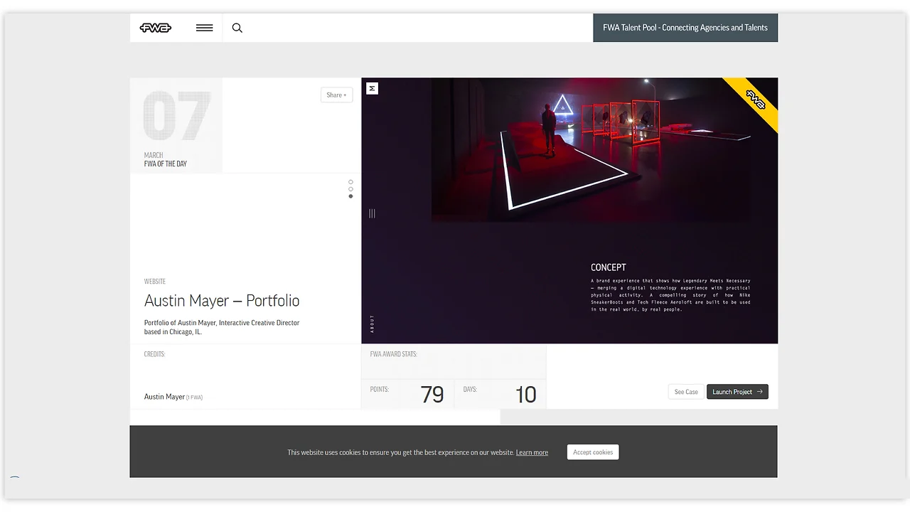 해외에서 활동하고 있는 디자이너들의 포트폴리오를 볼 수 있는 사이트로, 구글 및 페이스북 등 다양한 곳에서 일하고 있는 디자이너들의 웹 포트폴리오를 볼 수 있다.