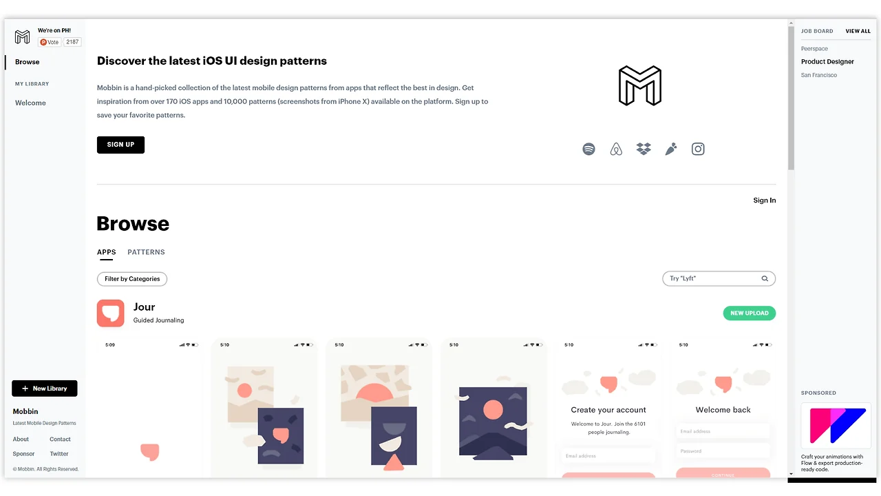 Mobbin은 최고의 디자인을 반영한 최신 모바일 디자인 패턴 컬렉션을 집계한 사이트로 플랫폼에서 사용할 수 있는 100가지 이상의 iOS 앱과 5,000가지 패턴을 벤치마킹할 수 있다.