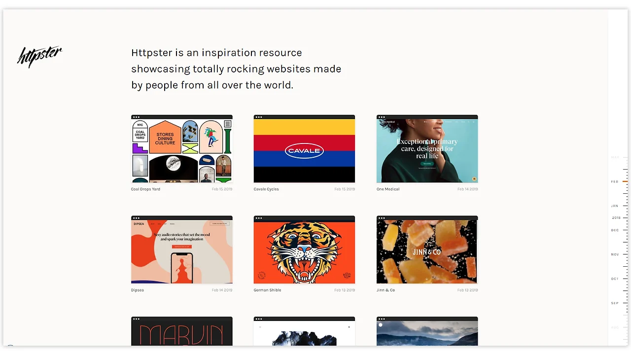 Httpste는 우측 사이드에 눈금으로 월 단위를 표시하고 사이드 메뉴에서 태그로 원하는 스타일의 웹사이트를 모아 볼 수 있는 기능을 가지고 있다.