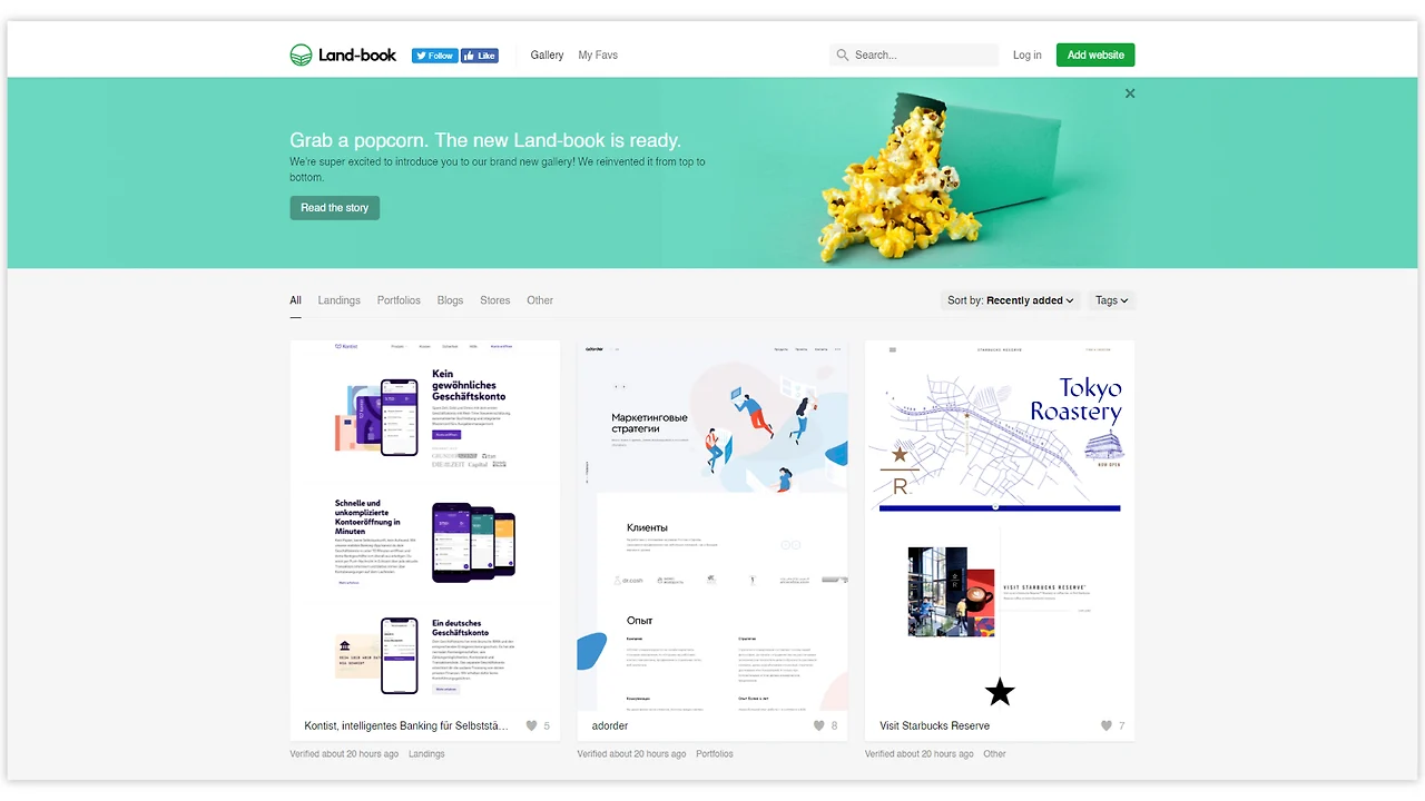 Landbook은 디자이너, 개발자, 제품 소유자, 마케팅 관리자, 프리랜서를 위해 만들어진 곳으로 훌륭한 디자인과 잘 만들어진 사이트를 높이 평가하는 모든 사람들을 위한 곳이다. 신중하게 수집된 웹사이트와 디자인 갤러리를 통해 소재와 영감을 찾을 수 있도록 도와준다.
