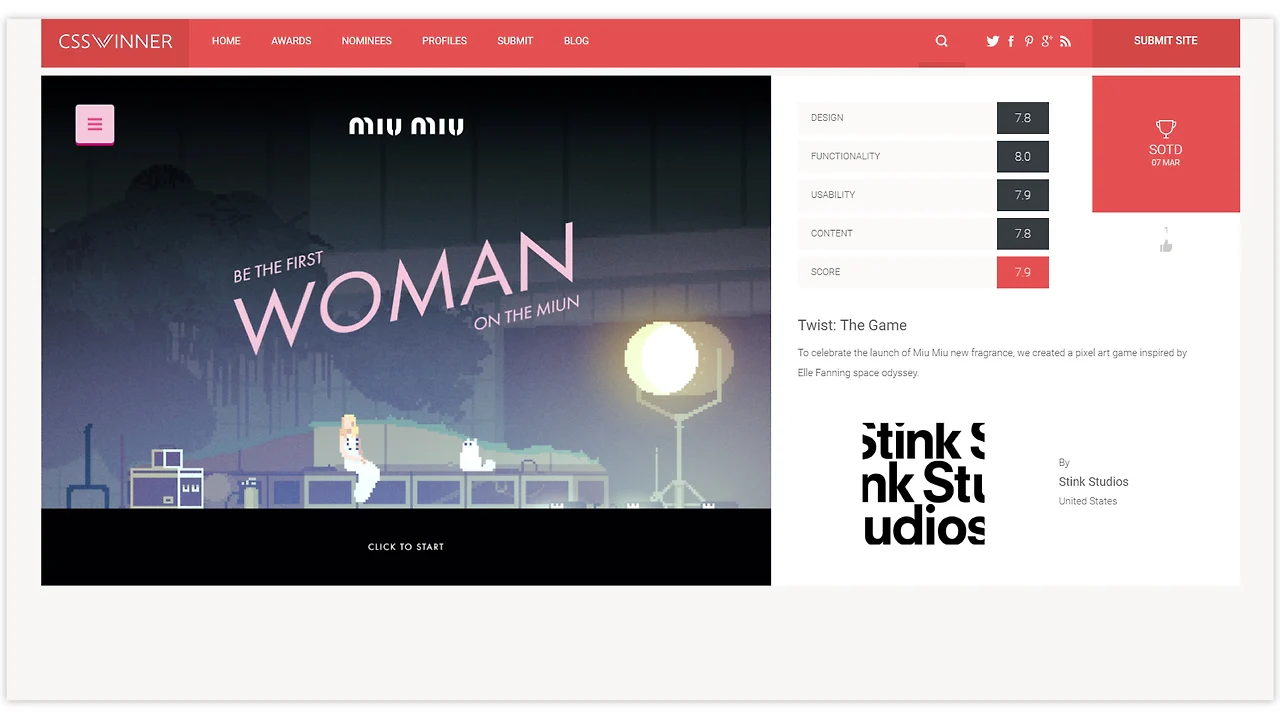 CSS 기술이 들어간 웹 사이트들을 소개하고 있으며 하루 동안 가장 많은 투표를 획득한 사이트가 메인 페이지에 보여진다.. 가장 많은 표를 받은 사이트는 Winners에서 확인할 수 있으며 CSS 디자인을 공부하거나 벤치마킹하기에 유용하다.