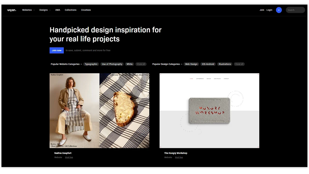 심플하고 깔끔한 디자인을 선호하는 디자이너들에게 사랑받는 사이트로 로그인을 하면 세이브 기능이 있어 나중에도 계속 살펴볼 수 있다. 또한 카테고리가 많아서 다양한 리서치를 할 수 있는 것은 장점이다.