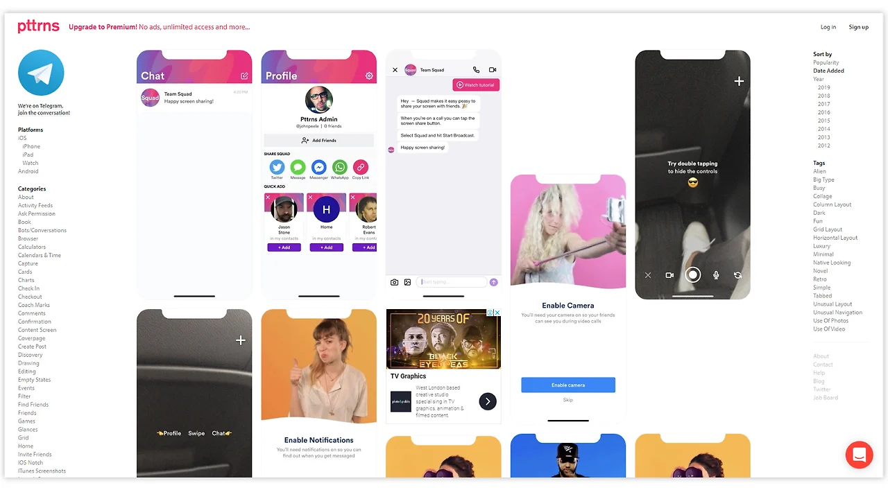 iOS 및 Android 앱의 스크린샷을 참고하기에는 Pttrns는 매우 훌륭한 참조 도구이다. 특정 기능을 쉽게 찾을 수 있는 기능 및 태그를 통해 앱을 나열하며 역사 목록은 지난 수년 동안 디자인이 어떻게 변화했는지에 대한 동향을 보여준다.