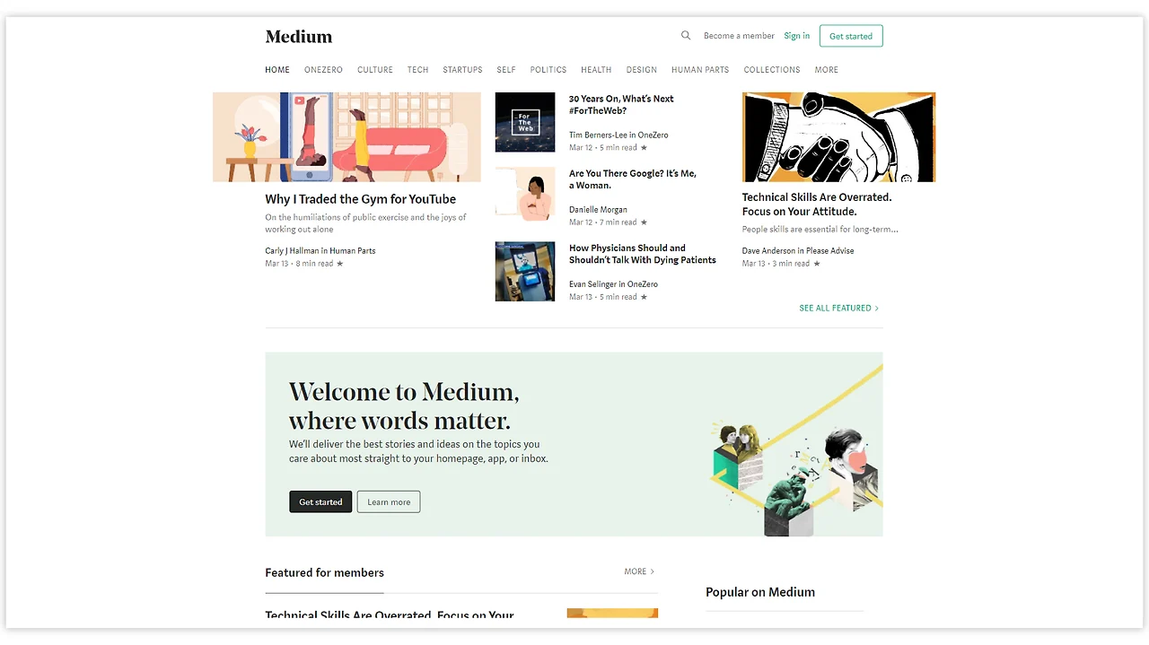 Medium은 자신의 기사를 작성하는 것 이상으로 유용하다. 실제로 모든 유형의 디자인 영감, UX 및 설계에 대한 이야기의 풍부한 자료가 가득하며 UI 디자인이나 제품 디자인과 같은 항목을 검색하면 많은 영감을 얻을 수 있는 사이트이다. 디자인을 하기 전에 이론적으로 참고하고 공부하길 추천한다.
