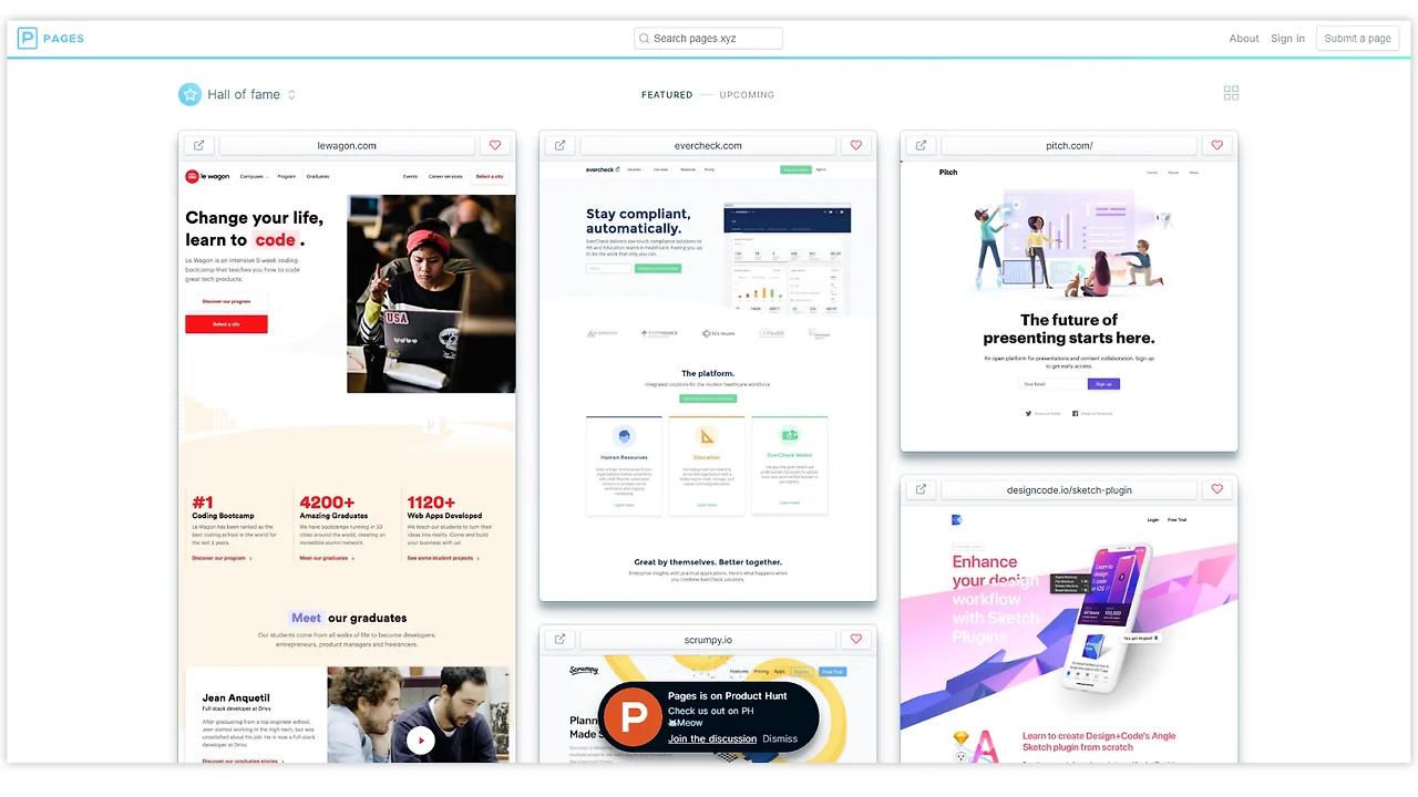 Pages는 페이지라는 섹션으로 세분화된 최고의 웹 디자인을 보여주며, 각 페이지는 가격, 제품, 방문 및 앱별로 정렬된다. 또한 차세대 디자인 프로젝트에 대한 영감을 신속하고 쉽게 찾을 수 있는 것은 덤이다.