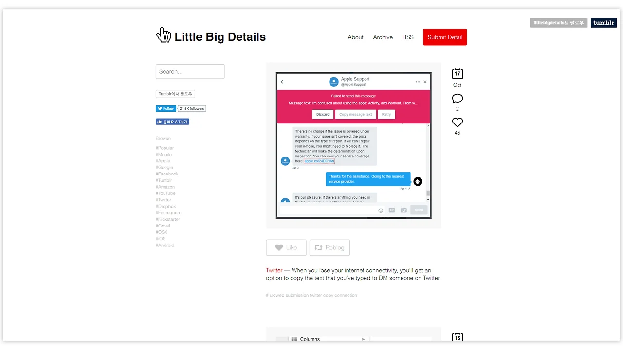 Little Big Details는 매일 업데이트되는 디자인의 디테일한 부분을 모아 놓은 사이트로 디자이너는 그것을 통해 영감을 얻을 수 있는 아주 훌륭한 장소이다.