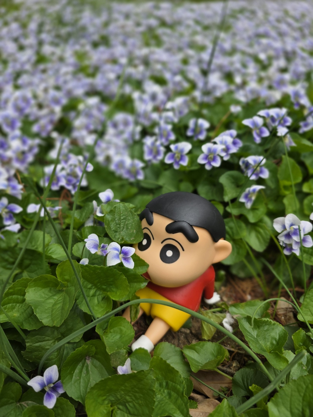 라일락 할머니가 좋으니 짱구도 보라색 꽃이 좋다며 화단안에 들어가 꽃향기를 맡는다.