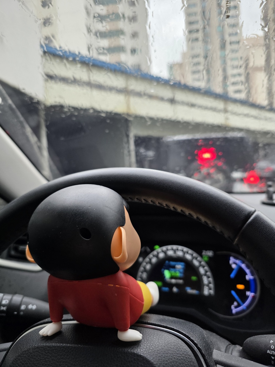 라디오의 음악, 비 오는 유리창, 운전대를 잡아보곤 신나 하는 짱구, 따뜻한 커피 향...