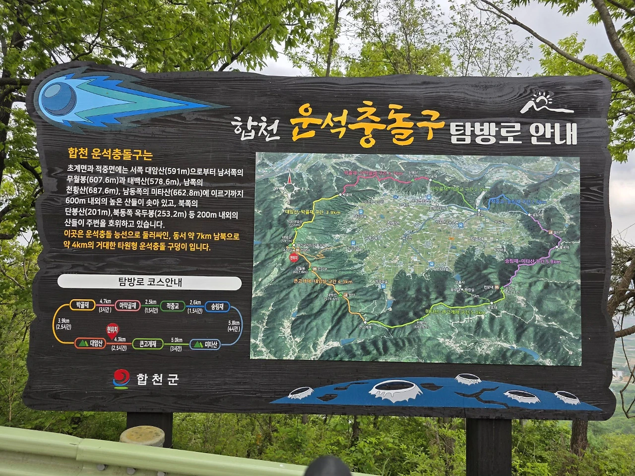 "여기 경남 합천에 있는 운석충돌구는 약 5만 년 전 빙하기의 끝자락 시기에 지름 약 200M 크기의 운석이 충돌하면서 만들어졌습니다. 초음속의 수십 배 속력으로 떨어진 운석으로 약 7km의 구덩이가 만들어졌고, 충격파로 밀려나간 바위들은 가장자리를 둘러싼 높은 산지로 남게 되었습니다. 이 충돌 구덩이는 오랫동안 호수가 되어, 호수 퇴적층을 쌓았고 인류가 정착하면서 지금의 비옥한 분지를 만들게 되었습니다."