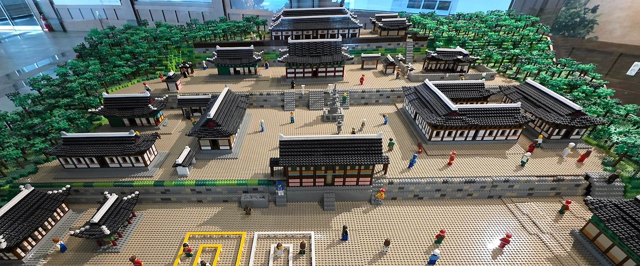 카메라로 레고로 만든 해인사와 팔만대장경의 인쇄과정을 순차적으로 설명하는 인형들을 천천히 보여준다.