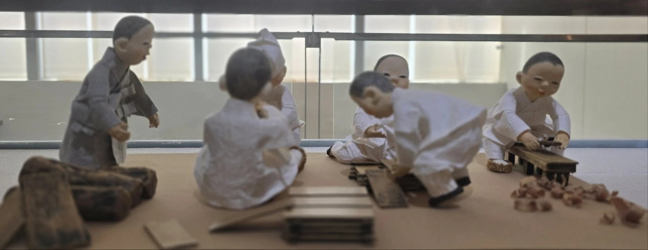 "이 장면은 바닷속에서 2년간 담갔다가 해풍에 말린 나무를 깎아서 만든 기본판을 제작하는 과정입니다"
