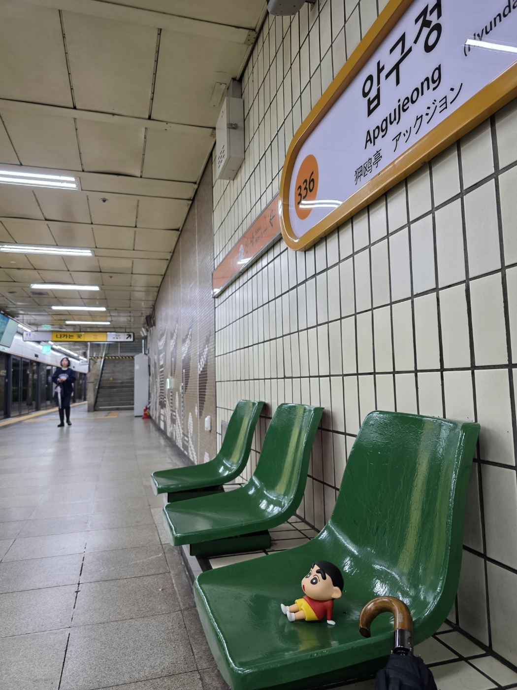 '압구정, 압구정 에끼 데스' 지하철을 내린 짱구가 잠시 쉬어 가잔다. 처음 지하철을 타서 그런지 어리둥절한가 보다.