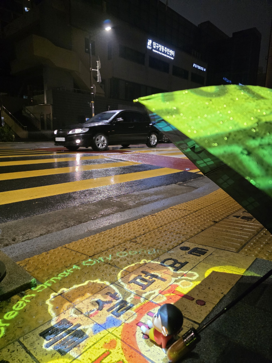 초등학교 앞 건널목에서 차가 지나가길 기다린다. 밤이라고 그냥 지나가면 안 된다.