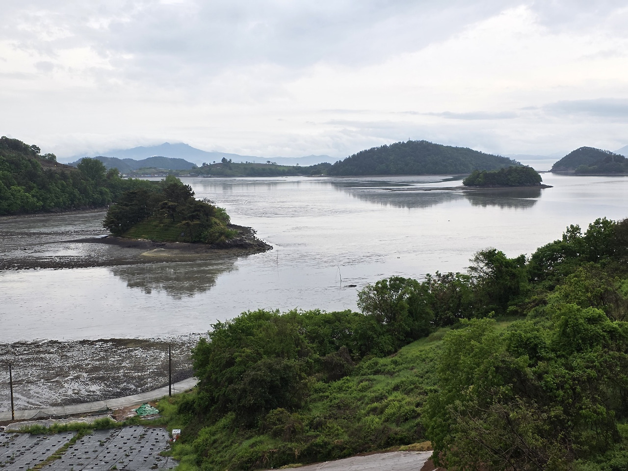 펜션에 도착하니 저 앞에 보이는 비에 젖은 다도해의 전경과 뻘밭에 반영된 섬의 반영이 그림처럼 다가온다.