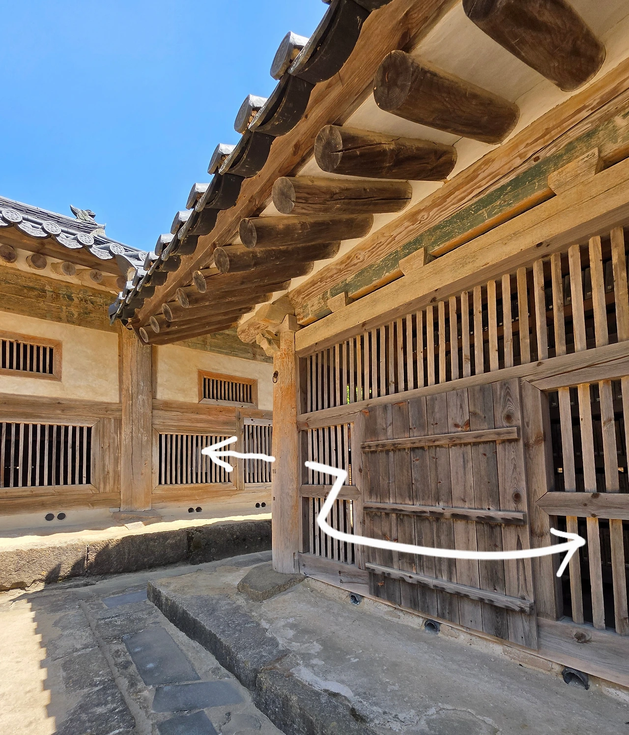 살창은 또한 바람의 세기를 조절하는 역할도 합니다. 강한 바람이 직접 목판에 부딪히는 것을 막고, 부드러운 공기의 흐름으로 바꾸어 내부 전체에 고르게 퍼지도록 유도합니다. 또한, 비가 들이치는 것을 막으면서도 공기의 순환은 가능하게 하는 절묘한 균형을 이룹니다.