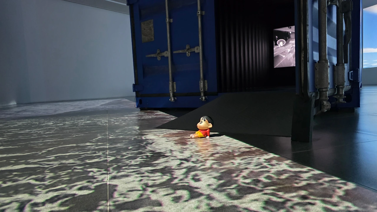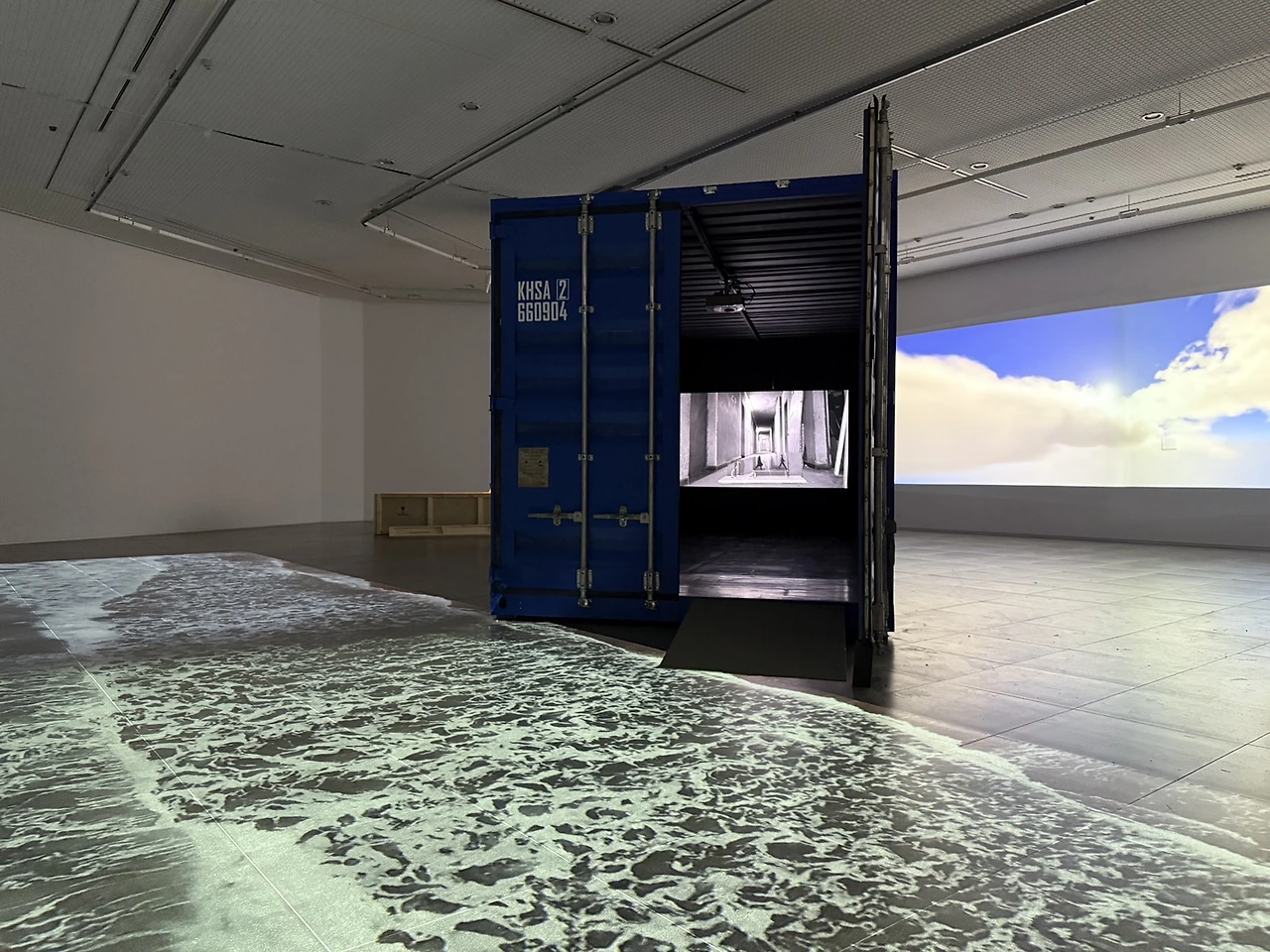 파도는 이 커다란 파란 컨테이너 박스를 이곳 전시장으로 실어 날랐다.