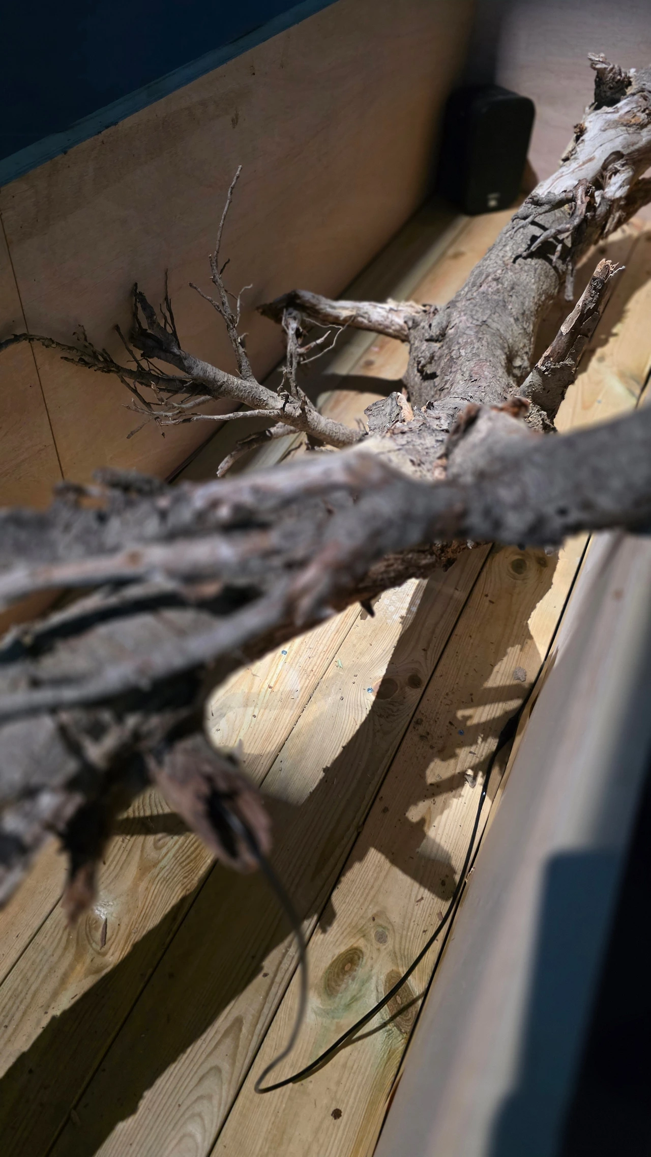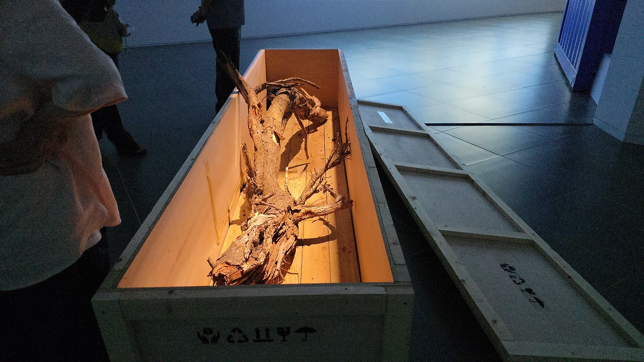 열린 큰 상자 안에는 죽은 고목하나가 놓여 있다.
