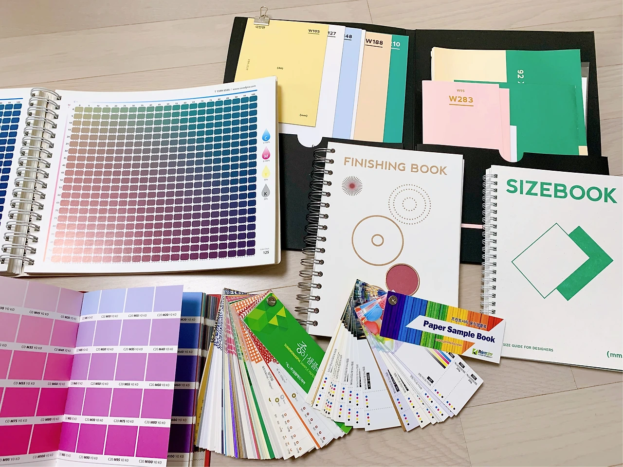 또 인쇄 종이의 재질, 두께, 인쇄 폰트의 크기, 후가공, 제본, 재단 등등 인쇄와 관련된 지식 또한 필요하다는 것을 많이 느꼈었다. 처음에는 비슷한 재질과 두께의 종이를 찾아서 인쇄소에 들고 가서 재질과 두께를 물어보곤 했는데 이후 '종이 샘플북', '컬러 차트 북'이라는 것이 있다는 것을 알게 되었다.