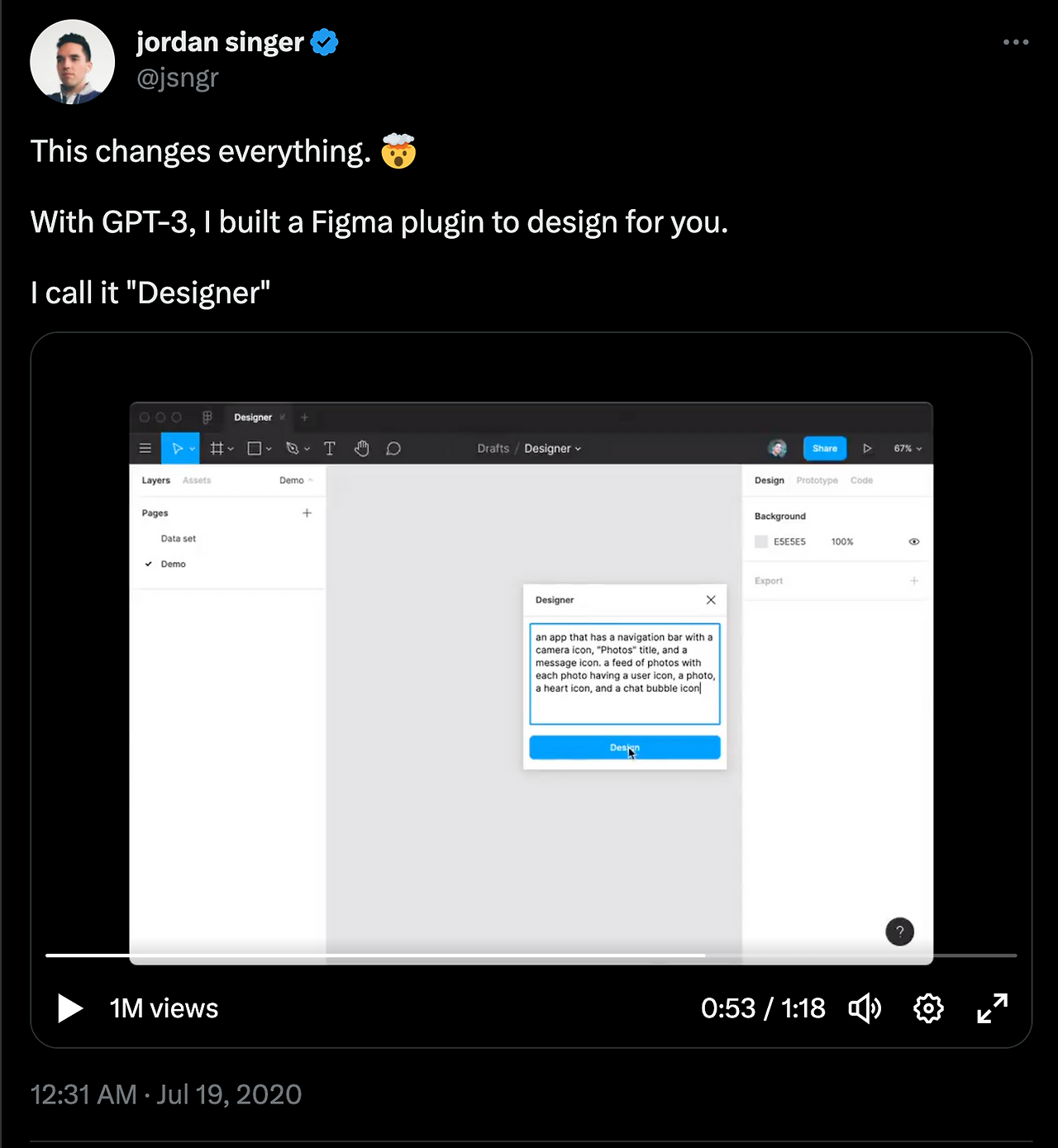 Generative AI 관련하여 처음 접한 건 2020년 Jordan Singer(전 CashApp Developer, 현 Diagram Founder)의 GPT-3을 이용한 피그마 플러그인이었습니다. 이걸 보고 나서, ‘아 이 사람 뭔가 하겠다’ 생각했는데, Diagram이라는 회사를 차리고 Genius와 같은 Generative design tool을 개발하고 있더라고요..