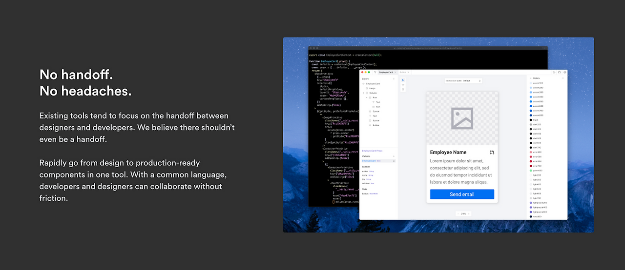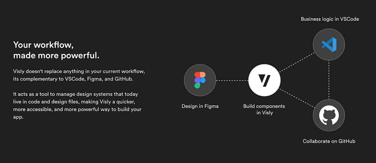 Visly.app이라는 회사가 있었습니다. ‘Handoff 하지 마세요.’라는 슬로건을 달고 나온 회사예요. ‘아니 이게 무슨 말이야?’라고 생각되실 텐데요. 말 그대로 ‘디자이너가 개발자에게 핸드오프 하지 않고, 스타일이나 컴포넌트를 Production-Ready Code로 배포까지 가능하게 하자!’는 비전을 가지고 만들어진 회사였어요.