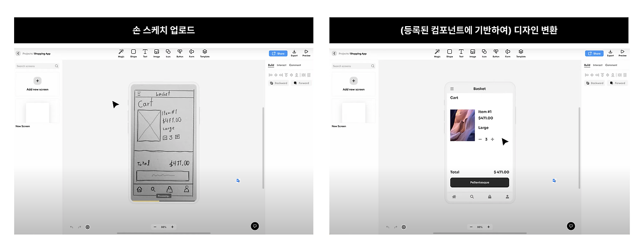 AI는 디자인시스템에도 영향을 끼칠 여지가 존재하는데요. 그건 uizard라는 툴에서 찾아볼 수 있어요. uizard는 오래전부터 AI Powered Design Tool을 표방하면서 오랜 기간 기를 모으고 있는데요. 위에서 말한 Text to design는 물론이거니와 디자인시스템만 존재한다면 손스케치 이미지를 (디자인시스템에 기반하여) 디자인으로 변환시켜 주는 기능도 개발되어 있어요. 피그마라고 못할까요?