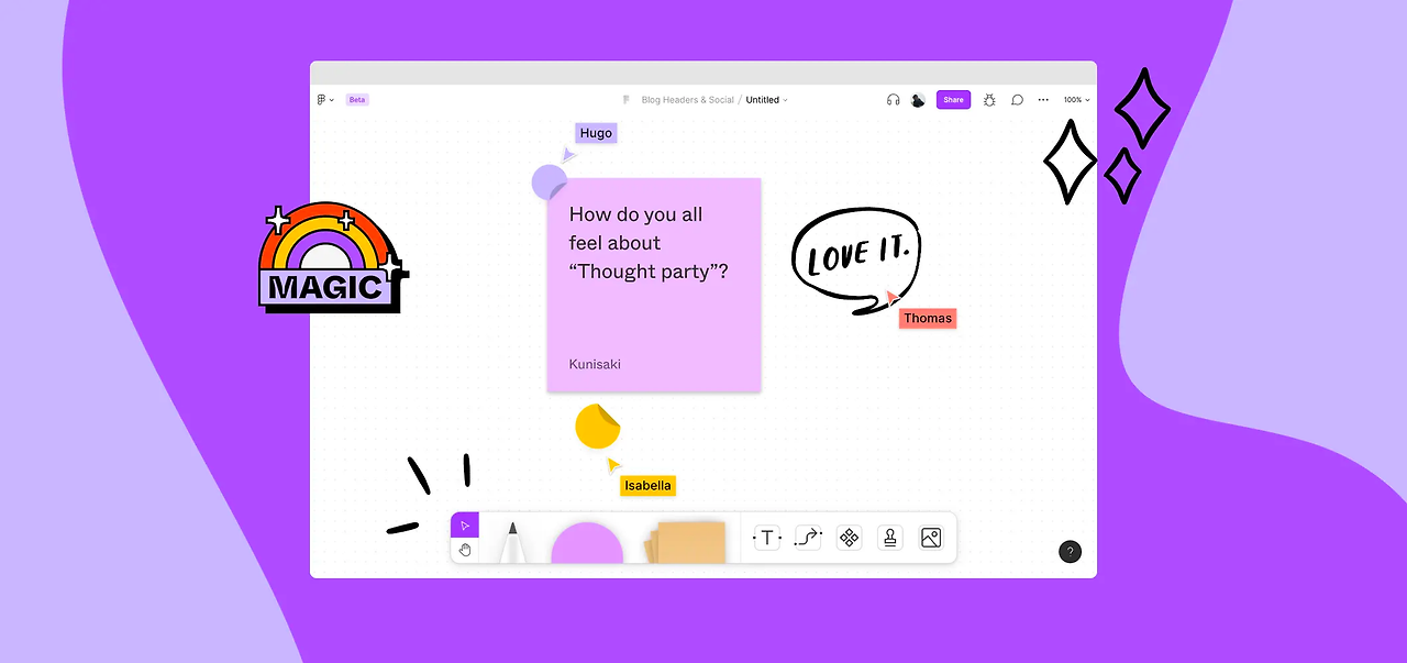 더불어 성공해 나가는 비즈니스에 두 번째 폭탄이 하나 더 빵 터지니, 그게 바로 피그잼이었어요. 지금으로부터 딱 2년 전에 업데이트된 이 기능은 기존 브레인스토밍툴 Miro를 대체하면서도 피그마 디자인 파일과는 호환성이 매우 좋은 ‘비디자이너들을 위한 선물’ 같은 기능이었어요.
