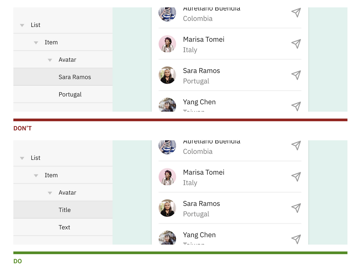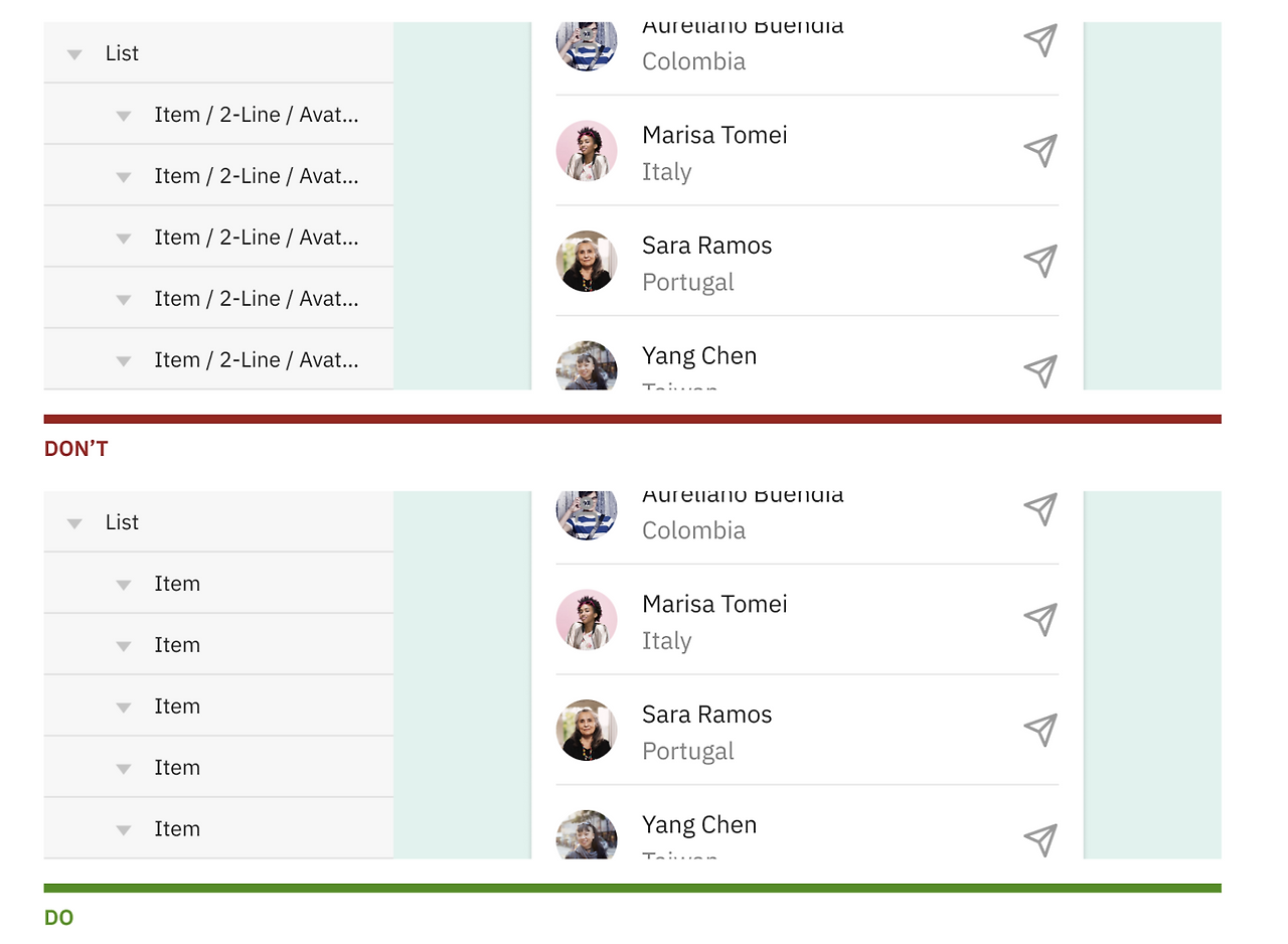 컴포넌트에 대한 인스턴스는 마스터컴포넌트 명을 그대로 갖다 쓰시는 경우가 있는데요, 이 부분은 명백히 잘못된 부분입니다. 인스턴스는 해당 컨텍스트에 맞게 자기만의 이름을 가질 수 있어요. 사람이라는 마스터 컴포넌트에 대해 모든 사람이 이름 없이 사람, 사람, 사람은 아니잖아요? 사람마다 이름이 있듯이 피그마안에서 생겨난 컴포넌트의 인스턴스도 컨텍스트에 맞는 이름을 정해주면 좋을 것 같아요.