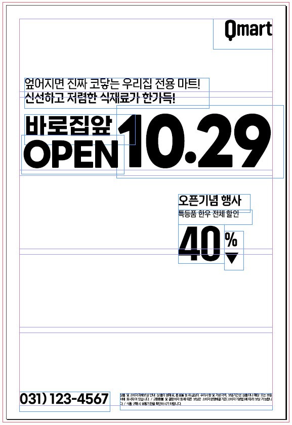 오픈날짜와 마트명, 주소 및 문의 정보가 정확한지 확인한 후 배치한다. 나중에 수정하는 습관은 담당자와 디자이너 모두 잊기 쉽다. 기본정보는 처음부터 정확하게 받거나 온라인상에 올려져 있다면 검색하여 디자이너가 직접 확인한다.