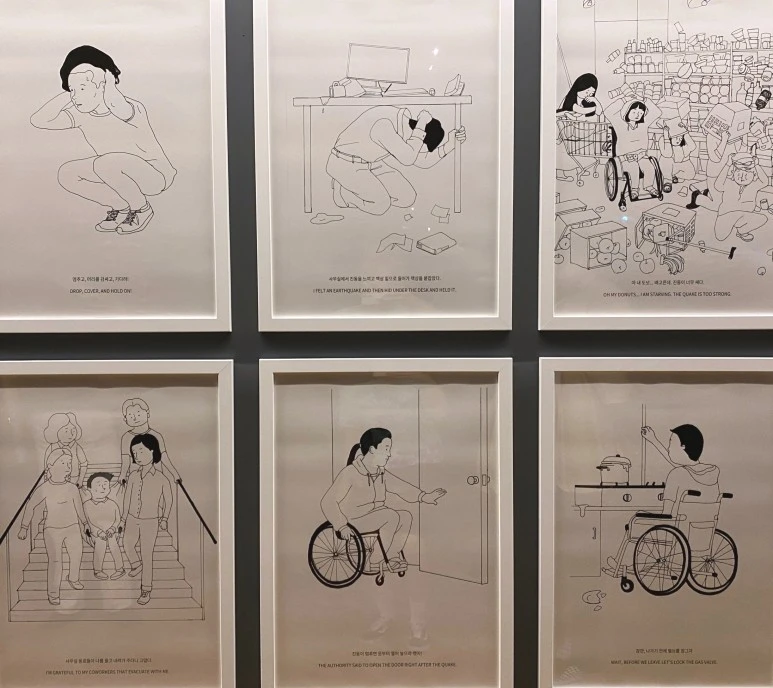 비엔날레관에 들어서서 보게 된 작품들은 모두 고유의 개성과 매력을 뿜어내고 있었지만, 그중에서도 마음을 울리는 것들은 우리 사회의 소외된 이들을 보듬는 작품들이었습니다. 거동이 불편한 장애인의 재난 대처 방법을 그린 일러스트레이션부터 수어를 활용한 작업까지. 예술의 사회적 역할 그리고 이러한 예술을 관람하는 우리의 역할을 생각해 보게 되었습니다.