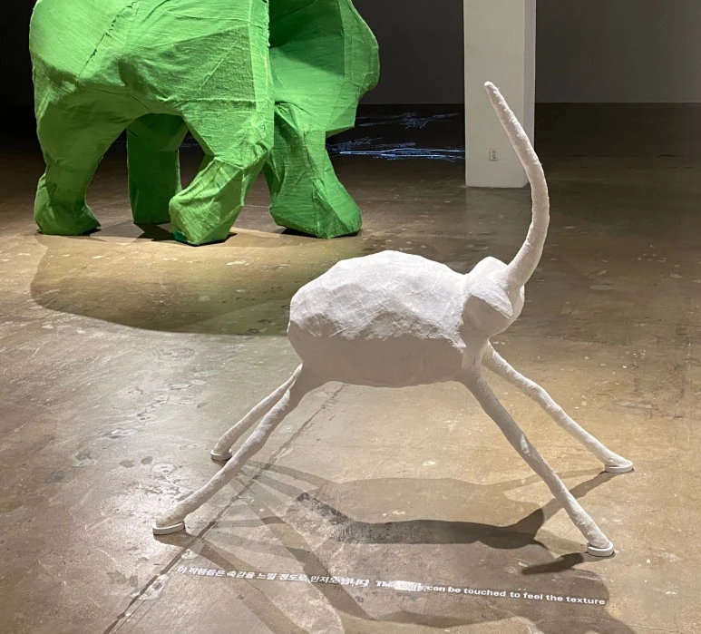 다음으로 엄정순 작가가 시각장애를 가진 학생들과 함께 진행한 프로젝트 "코없는 코끼리" 또한 기억에 남는 작품이었습니다. 작가는 장애 학생들이 청각, 촉각, 후각으로 느끼고 상상한 코끼리를 조형물로 재해석하고 이를 통해 관객들에게 세상을 인지하는 다양한 방식을 생각해 볼 수 있게 하였습니다. 저 또한 이 코끼리 조형물들을 눈 감고 만져보며 그들이 상상하는 코끼리를 떠올려보았고, 시력을 잃은 사람들이 세상을 읽어내는 방식을 어렴풋이 상상해 보았습니다. 우리는 보통 우리 자신의 관점에서만 생각하며 살아가지만, 우리가 함께 살아가는 수많은 사람들은 그들의 수만큼 다양한 관점을 갖고 살아감을 인지하길 바라는 작가의 메시지를 통해 반성과 동시에 통찰을 얻을 수 있었습니다.