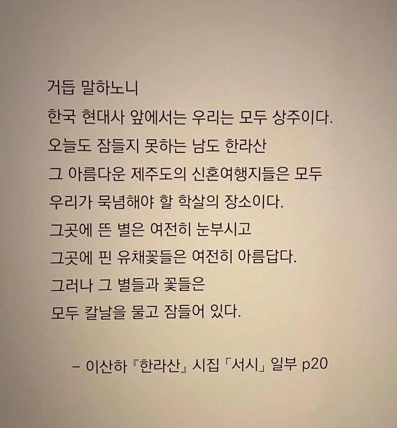 많은 이들의 아픔을 안아주었던 광주비엔날레 전시 관람을 마친 후, 광주 시립미술관을 찾았습니다. 이곳에서도 여러 전시를 볼 수 있었지만, 박경훈 작가의 기획초대전 4.3 기억 투쟁 새김과 그림 전시가 유독 머릿속을 떠나지 않았습니다. 제주에서 나고 자란 작가는 1948년 4월 3일 일어난 비극적인 사건을 되새기며 진실을 잊지 않으려는 의미를 작품에 담아내었습니다. 박경훈 작가의 목판화는 거칠고 묵묵하며 비통함을 절로 느끼게 만들었습니다. 제주 4.3 사건과 광주 5.18 민주화운동이 가진 비극적인 역사를 담담하게 풀어낸 예술작품들은 시간이 지나도 잊히지 않기를 바라는 모든 이들의 마음을 대변하고 있는 것 같았습니다.