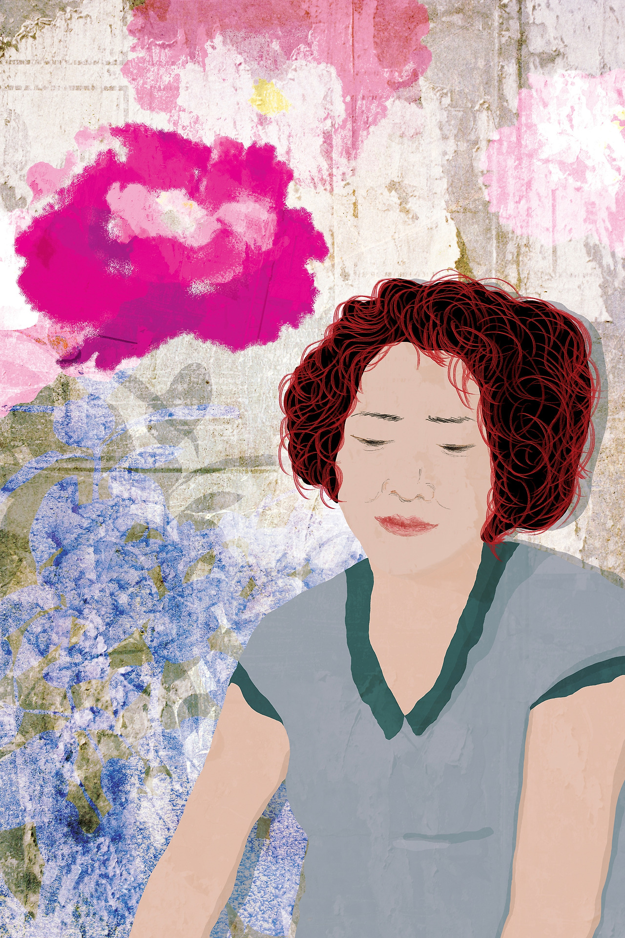 야근이 많은 디자이너이다 보니 새벽마다 조금씩 그려 완성된 그림을 엄마는 아주 만족해하셨다. 아마 배경으로 가장 좋아하는 자주색 목단을 그려 넣어서가 아니었을까? 꽃을 좋아하시니 아마 본인의 얼굴보다는 그 옆에 꽃이 좋았을 게다.