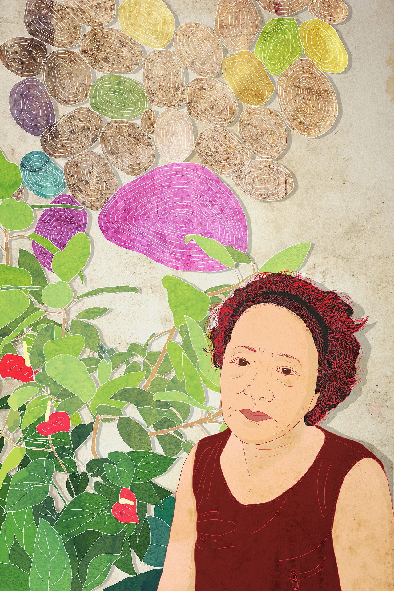 그림을 그리기 전에 고민을 하다 엄마의 뒷 배경에 살아온 시간을 보여주는 나무의 나이테 같은 지문들을 그려 넣었다. 엄마의 손에도 오래 살아온 시간의 흔적이 있을 테니. 인물을 크게 그린 적이 없어 어려웠지만 사실대로 그려서 엄마의 특징이 잘 드러난다고 생각했는데 완성된 그림을 보고 엄마는 '버럭' 화를 낸다.