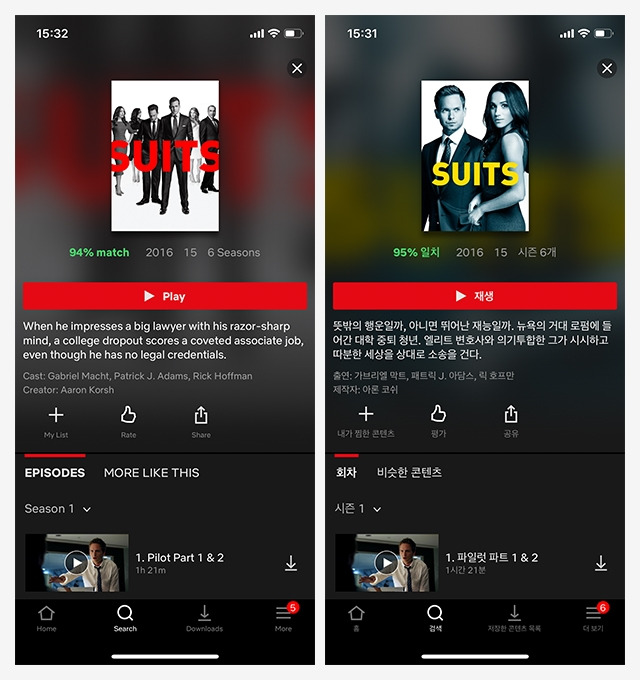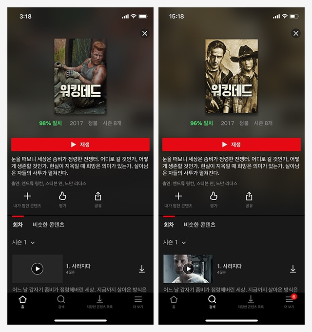 저와 제 친구가 워킹데드와 SUITS를 검색해봤습니다. 각각의 콘텐츠를 검색한 시간을 확인하면 아시겠지만 거의 같은 시간에 검색했고요, 친한 친구이니만큼 선호도는 비슷하지만, 평소 콘텐츠를 소비하는 취향이 다른만큼 커버 이미지가 조금 다르게 뿌려지네요.