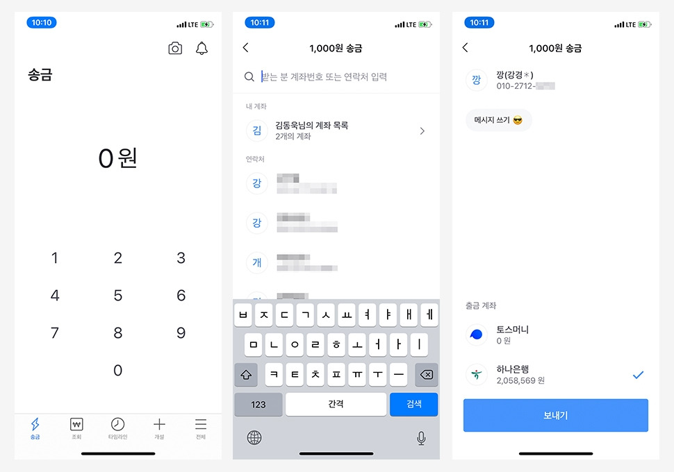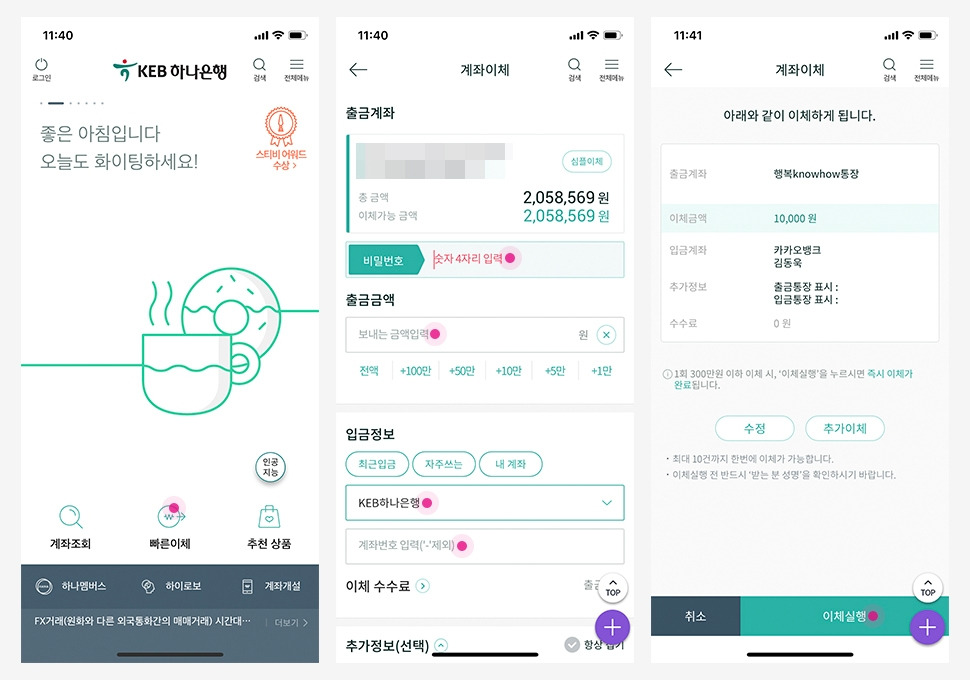 최근의 앱 중에 덜어내기에 집중한 서비스로 모바일 금융 플랫폼 'TOSS'가 있습니다. TOSS가 어떤 것을 어떻게 덜어냈는지 알기 위해선 기존 은행 앱을 살펴볼 필요가 있습니다. 뱅킹 서비스의 대표적인 예로 그래도 나름 신경 쓰고 있는 것 같은 KEB하나은행 앱을 살펴보겠습니다. 두 개의 서비스에서 친구에게 송금을 해보았습니다.