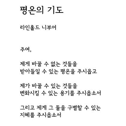 혹시 평온의 기도(Serenity Prayer)라고 알고 계신가요? 20세기 신학자인 라인홀트 니버(Karl Paul Reinhold Niebuhr)가 쓴 기도문이고 내용은 위와 같습니다.