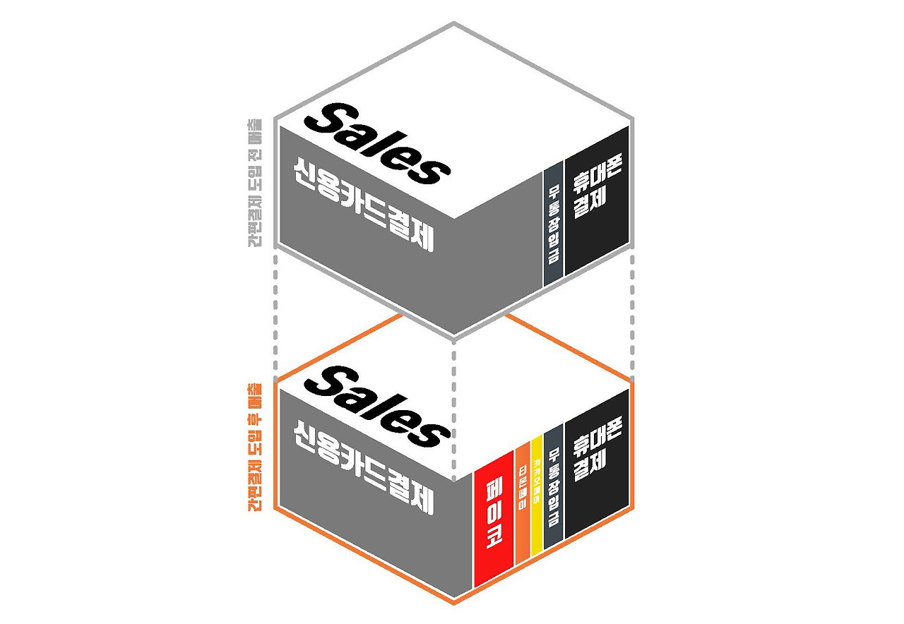 2년 간 4배라는 성장률에 소비자의 인식까지 좋은 간편결제. 하지만 이렇게 긍정적인 수치와는 반대로 서비스 공급자 입장에서 간편결제 서비스가 보여준 긍정적인 시그널은 생각보다 적습니다. 결제액과 가입자 수 모두 폭발적으로 증가하고는 있지만 간편결제를 도입한 업체나 카드사의 총 결제액에는 큰 영향을 미치지 못하고 있는 거죠.