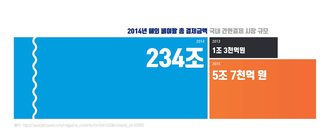 해외 성공사례로는 미국 Paypal, 중국 Alipay가 있습니다. Paypal의 2014년 총 결제 금액은 234조원을 기록했을 정도죠. 국내에서는 2014년 '공인인증서 의무 사용 폐지' 법안 통과로 금융 규제가 완화됨과 함께 기술력과 자본력을 갖춘 국내 기업들이 너나 할 것 없이 간편결제 서비스를 선보였습니다. 그 결과 간편 결제 시장의 덩치는 2015년 기준 5조 7000억(13년 대비 4배 성장)의 규모로 성장했고 지속적으로 성장할 것으로 보입니다.