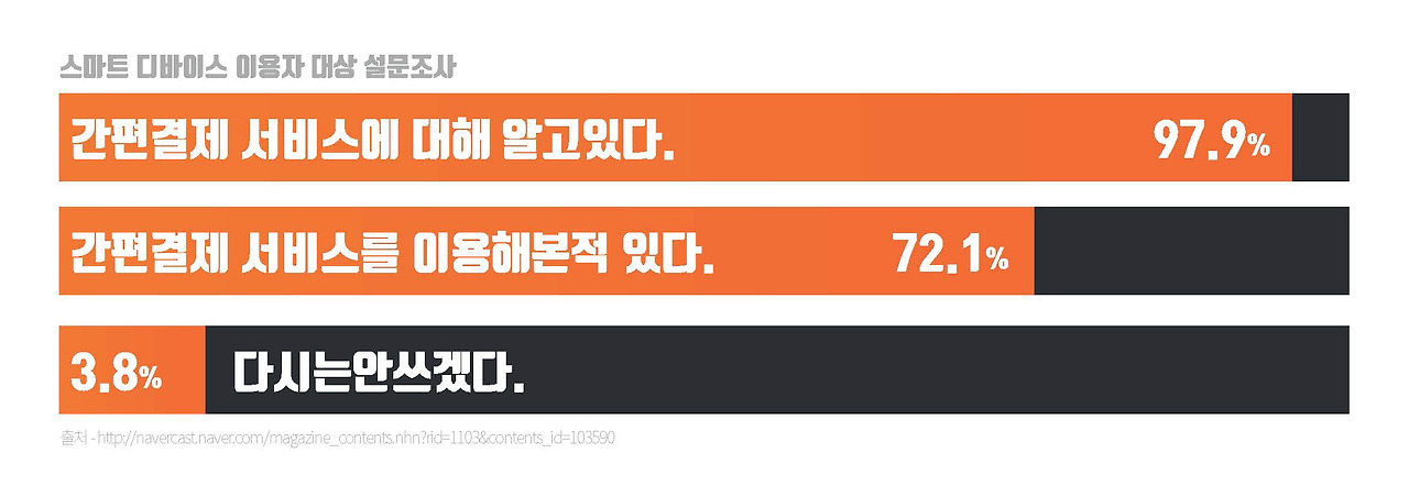 전체 스마트 디바이스 이용자를 대상으로 간편결제 서비스에 대한 설문 조사 결과도 있습니다. 무려 97.9%의 이용자가 간편결제 서비스에 대해 인지하고 있었고 이를 이용해봤다는 응답도 72.1%에 달했습니다. 거의 모든 이용자가 간편 결제를 알고 있고 10명 중 7명은 이용해본 경험도 있으니 굉장히 높은 수치라고 생각되네요.