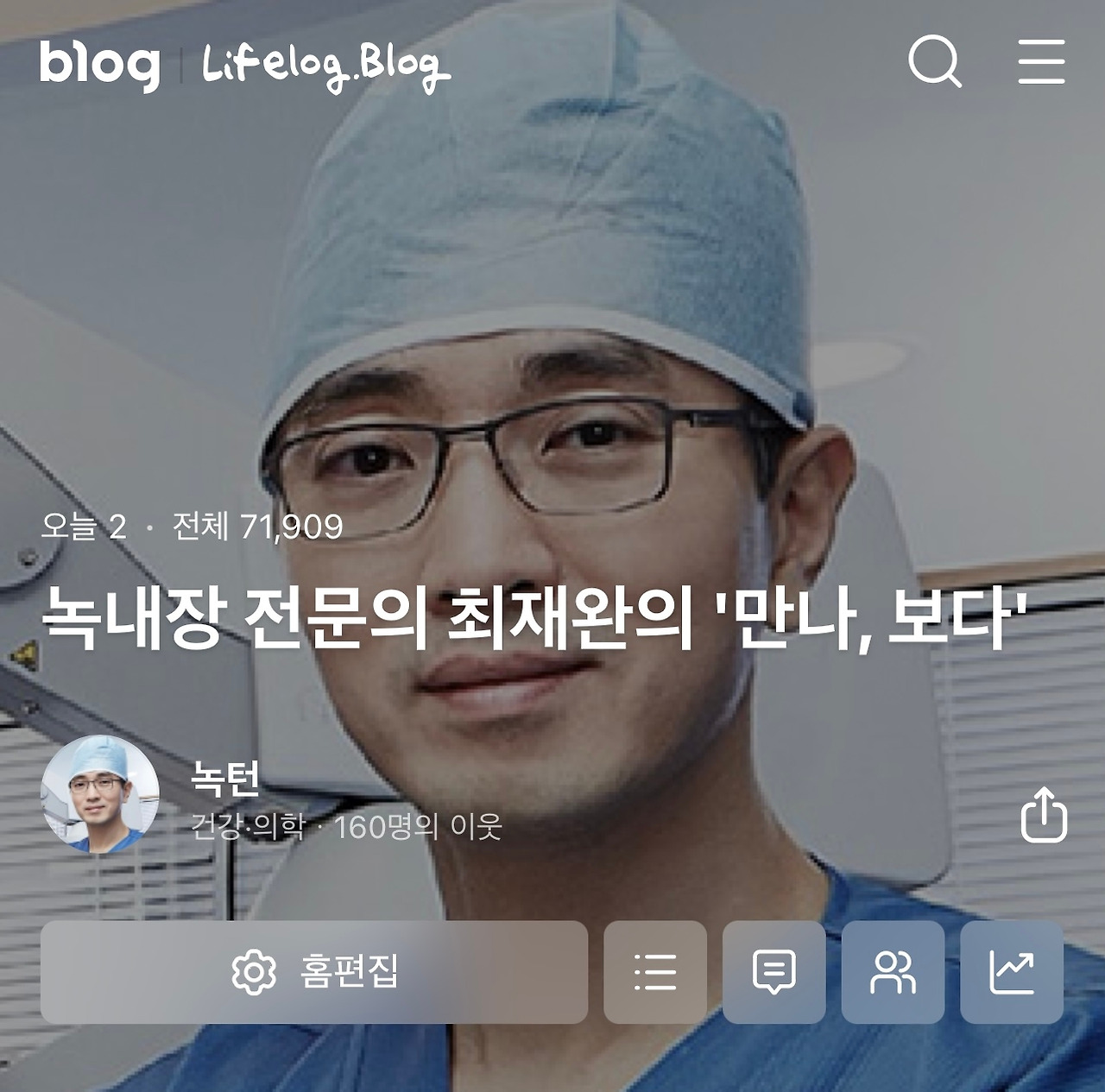 서울아산병원에서 녹내장 임상강사로 진료를 보다 보니 현실이 너무 답답해서 녹내장 환우회에서 환자들의 질문에 답글을 달아주는 활동을 몇 년 동안 했습니다. 갈수록 시간은 부족한데 비슷한 질문에 답을 다는 일이 좀 의미가 없는 것 같아서 네이버에 있는 제 개인블로그에 유형이 비슷한 질문들을 카테고리별로 분류해 놓았습니다. (네이버 블로그 <녹내장 전문의 최재완의 ‘만나, 보다’> https://bit.ly/3DI739Q )