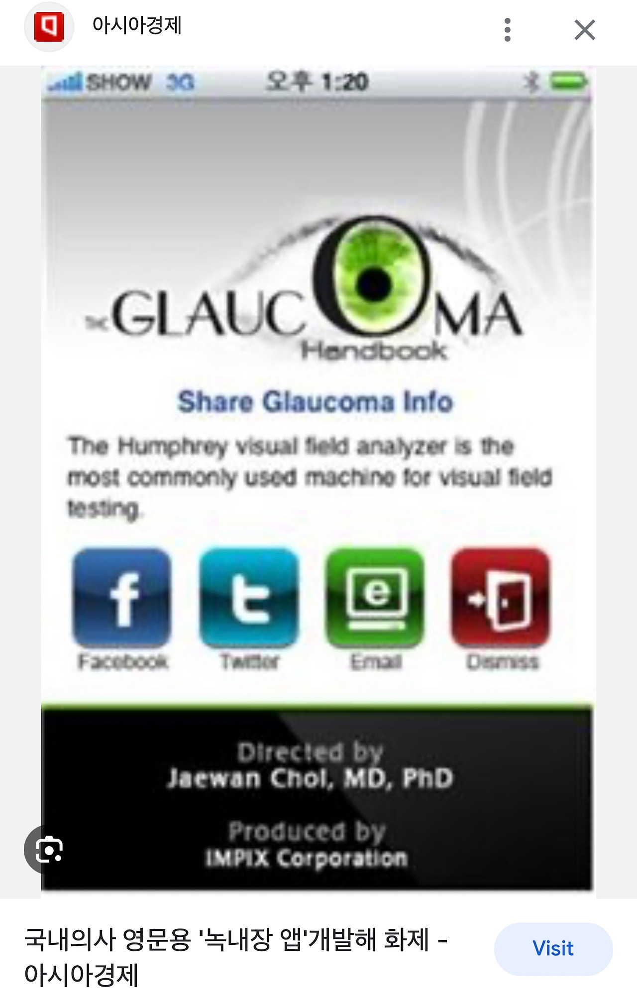 인천의 안과전문병원인 한길안과병원 의사로 취직한 이후로는, 온라인에서만이 아니라 제가 오프라인으로 실제 만나는 환자분들에게도 도움을 드리고 싶어서, 당시 병원의 홍보대사이셨던 가수 김장훈 님을 표지모델로 <김장훈과 함께 하는 녹내장상식사전>이라는 소책자를 만들었습니다. 제가 썼을때는 사람들이 잘 안 읽었는데 표지에 김장훈님이 들어가니 사람들이 읽기 시작했습니다. 반응이 꽤 좋았습니다. 그래서 당시 아이폰이 막 보급되기 시작하던 시점이었고, 이것을 아이폰 애플리케이션으로 만들어 보면 어떨까 하는 생각이 들었습니다. 병원에 지원 요청을 하였고 그 당시로는 꽤 큰 거금을 도와부셔서 아이폰용 앱으로 만들었고, 첫 시도여서 그런지 언론에서도 주목해 주었습니다. (관련기사 https://bit.ly/44UEiCF)