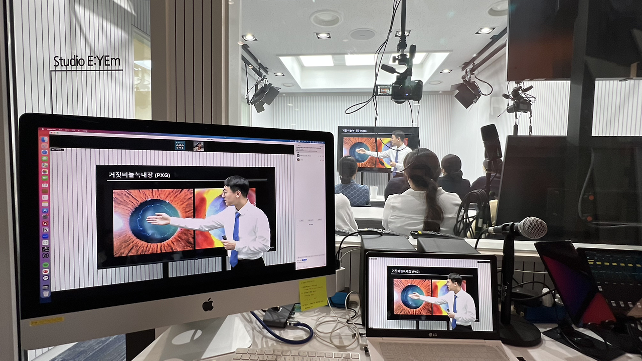 저희 스튜디오의 정식 이름은 <스튜디오 이음 Studio E:YEm>입니다. 눈 전문 (EYE) 미디어(m)이면서, 병원과 고객들을 가상의 공간에서 ‘이어주는’ 공간이라는 뜻입니다. 병원 공식채널인 <닥터스TV>이외에, 저희 녹내장 팀에서 자체적으로 운영하는 <녹내장TV>의 제작이 매우 활발히 이루어지고 있습니다. 환자들을 대상으로 하는 방송 이외에도 원내 구성원 교육도 온오프라인 동시에 시행할 수 있습니다.