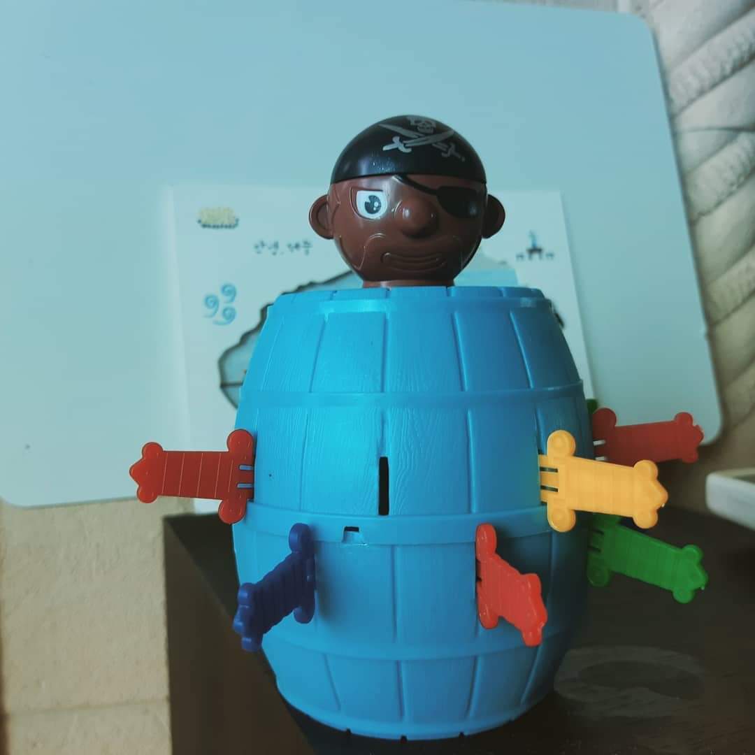 딸이 어디선가 이 놀이 기구를 가지고 와서 둘이서 한참 게임하며 놀았다. 막상 게임을 해보니 별 것 아닌 게임 같은 데도 긴장감이 장난 아니다. 칼을 하나둘 번갈아 꽂을수록 다음 칼, 그다음 칼에 해적이 튕겨오를 확률이 높아지며 심장이 점점 두근거렸다. '이번에 꽂는 칼에 펑 튀어 오르면 어쩌나.' 해적이 잘 버티길 빌며 조심스레 칼을 꽂고, 꿈적 않는 해적을 확인하고 안도했다. 그러다 또 내 차례가 돌아오고, 다시 돌아오고... 밀려오는 긴장감에 칼을 쥔 손이 파르르 떨렸다.